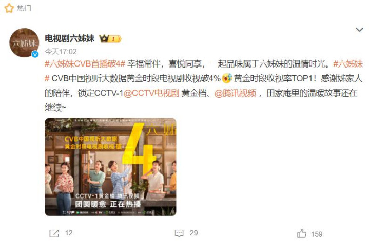 从首播的数据上看,《六姊妹》黄金档单集高达4.23,也就是说,这部剧首播收视率就已经破4,这个数据意味着什么呢?《小巷人家》的首播收视率也成功破4,《国色芳华》的首播收视率破3,从这部剧的关注度上看,也就是说,《六姊妹》绝对有成为黑马剧的潜力。